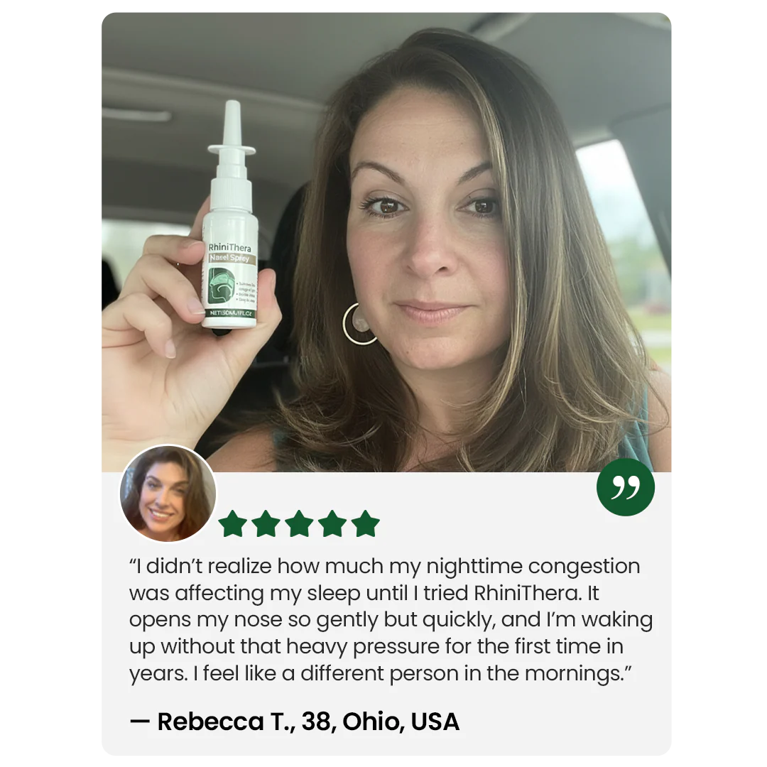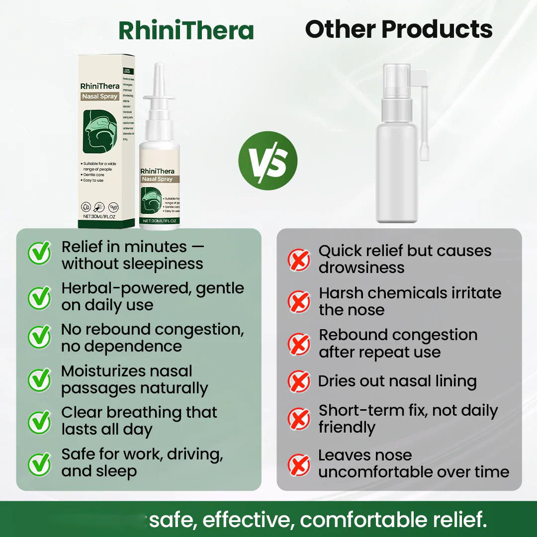 RhiniThera is designed to support relief from sneezing, sinus pressure, nasal congestion, dryness, and general nasal irritation, especially when triggered by seasonal changes, pollen, indoor air, dust, or wind.
